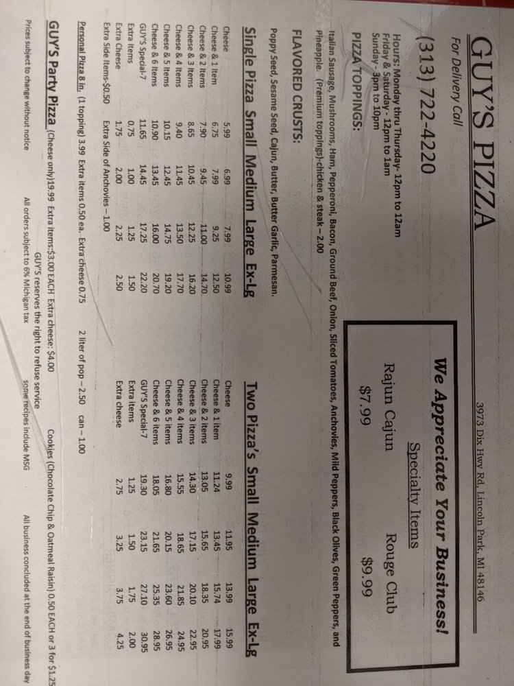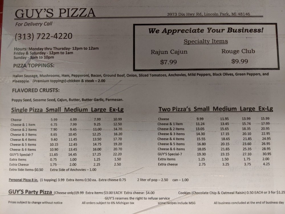 Welcome to Guy’s Pizza, a culinary gem nestled in Lincoln Park, MI. Known for its vibrant menu and welcoming atmosphere, this pizzeria offers an array of options, from classic cheese pizzas to customizable creations stacked high with toppings.